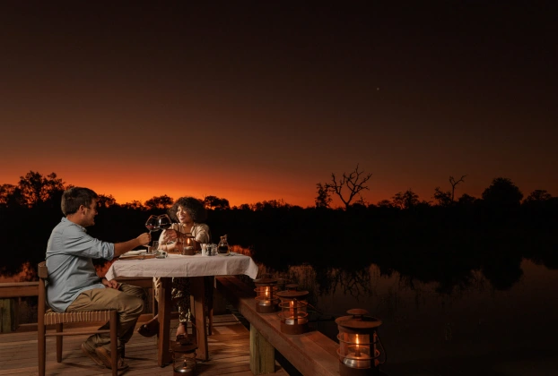 Enjoy exquisite gourmet meals beside tranquil waters, illuminated by lanterns and stars, creating an intimate and enchanting dining experience under the African night sky.