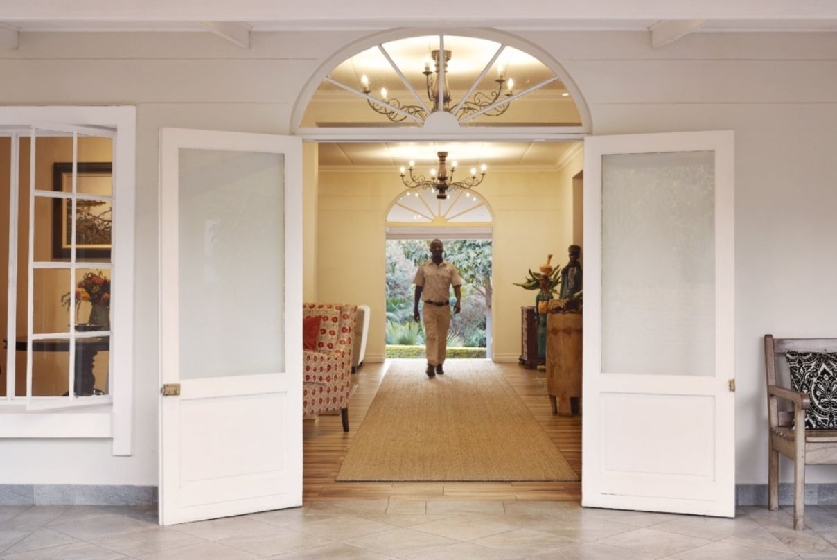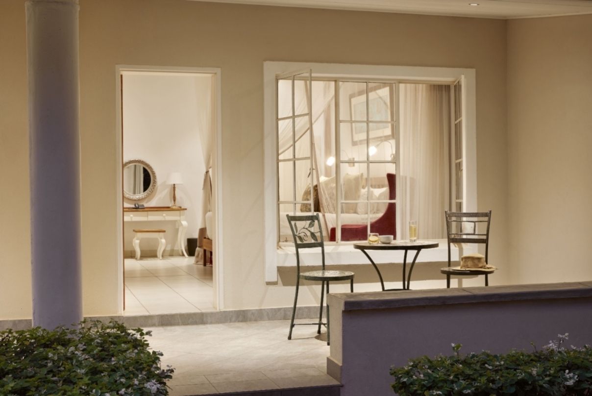 Eleven rooms with spacious patios look out over a private garden with manicured lawns and indigenous trees that offer a welcome perch to a variety of birdlife. Eight of these rooms inter-lead and are ideal for families or groups travelling together. Each large, well-appointed room boasts a spacious en-suite bathroom with double basins and large shower.
