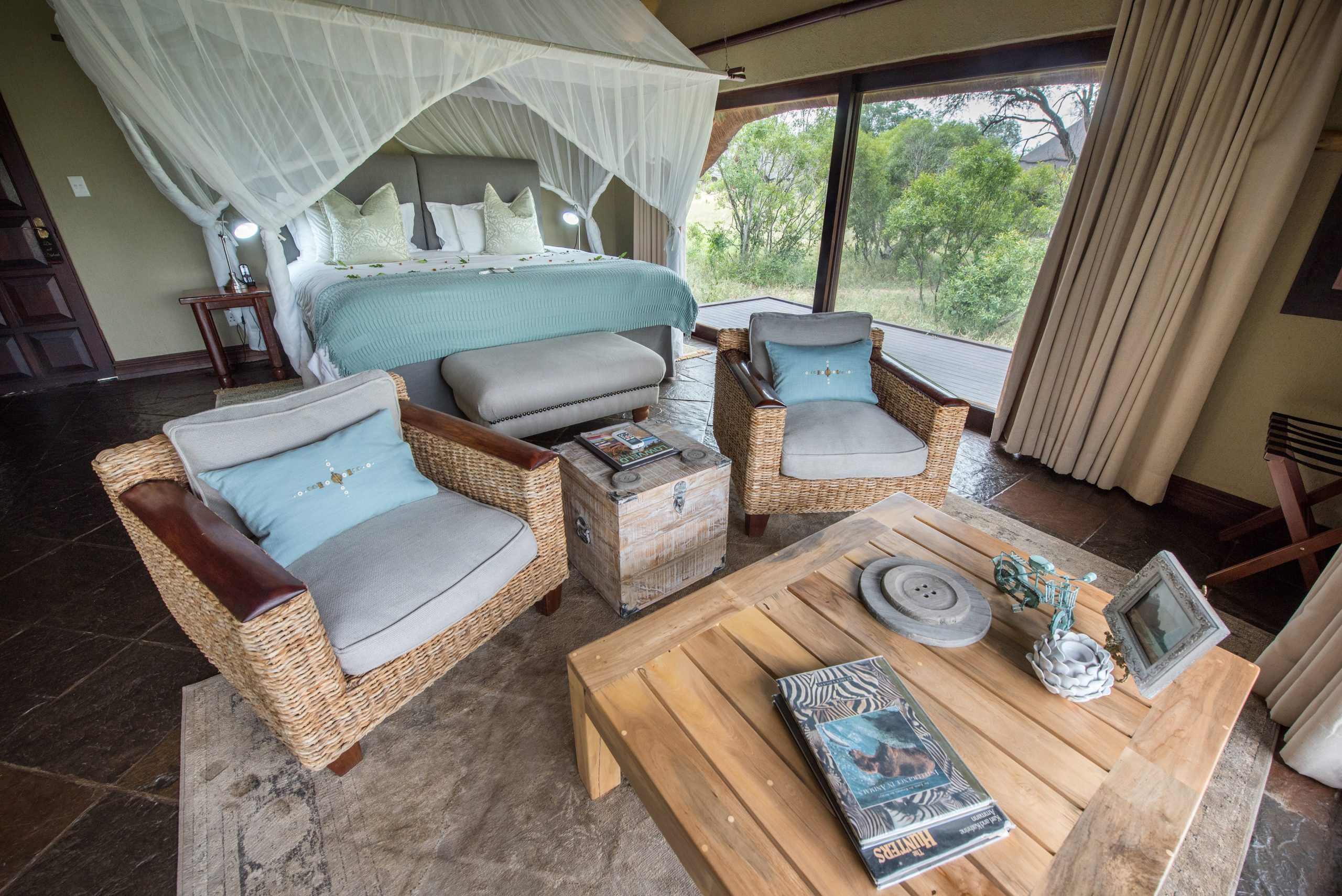 Kambaku River Sands offers privates Suites all with their own private viewing decks, well equipped with Air-conditioning, all inclusive minibars as well as well stocked coffee stations, beds are super king and are all extra length, however these can be converted to Twins. En-suite facilities include free standing baths, indoor showers as well as an outdoor shower facility.